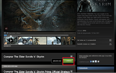 Ao clicar, irá abrir uma página do game na steam, com trailer's e informações. Então você clica em +CARRINHO: